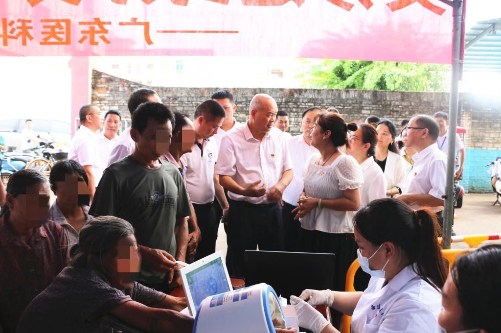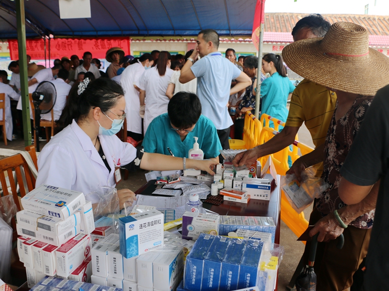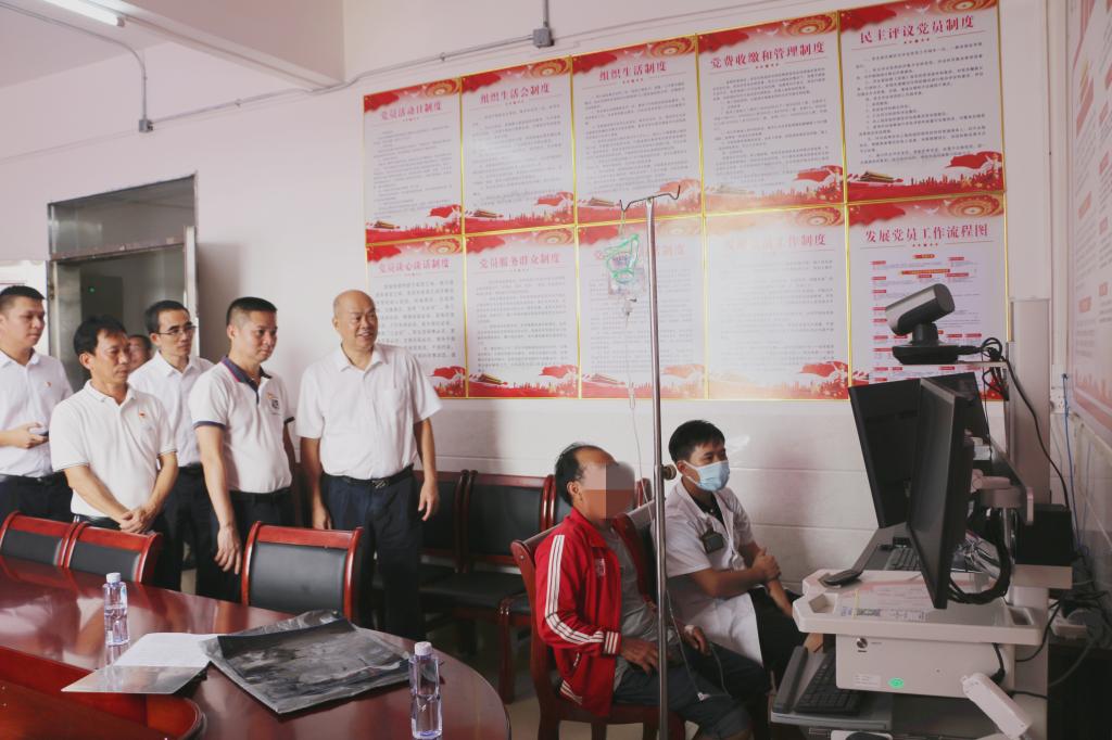 签约仪式后,卢景辉、梁汉飞一行走进西连镇卫生院,详细了解义诊情况,查看附属二院与西连镇卫生院远程会诊。来自附属医院、附属第二医院心血管内科、内分泌科、呼吸内科、消化内科、中医科、泌尿外科、甲乳外科、创伤骨科、康复医学科、超声医学科的20余名专家在西连镇卫生院开展义诊及送医送药活动,耐心为当地近千名群众解疑释惑,详细了解疾病史、用药情况等,为他们提供了多方面的健康指导,并结合当地群众参与农活生产较多、容易出现腰肌劳损等情况,派出康复医学科、中医科的专家现场为群众开展理疗。据统计已累计为当地群众免费提供60余种药品,价值过万元。
