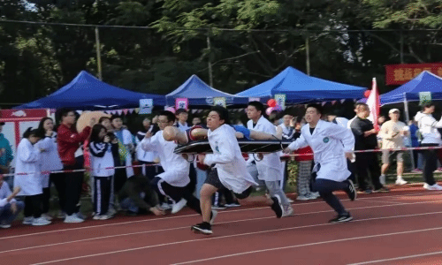 近年来,学校将4*100米担架跑列入校运会项目,一队16人,分为4组,以接力的形式抬着担架模拟真实抢救的场景进行比赛。担架上配备1:1的假人模型,三组学生抬着担架先接力跑3 × 100米,最后一组转换到急救床,推运“患者”到达终点完成院“入院前”接力。在传统接力项目上增加了医学特色,比赛就像一场演练,更是一节生动的生命教育课,学生们跑出了“救死扶伤”的速度。