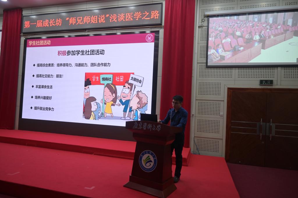 刘梦辉师兄深情回忆了当年在母校的求学之路,坦诚分享了个人成长发展过程中的收获与感悟。他鼓励同学们一定要珍惜大学时光,努力学习知识、增长才干;明确人生目标,坚守初心,积极探索;将个人理想与社会需求相融入,走出广东医人的特色之路。他还勉励临床学子要牢固掌握临床基础知识,熟练掌握临床技能操作技能,积极参与科研活动和社团活动,努力提高自身的综合素质和社交能力。