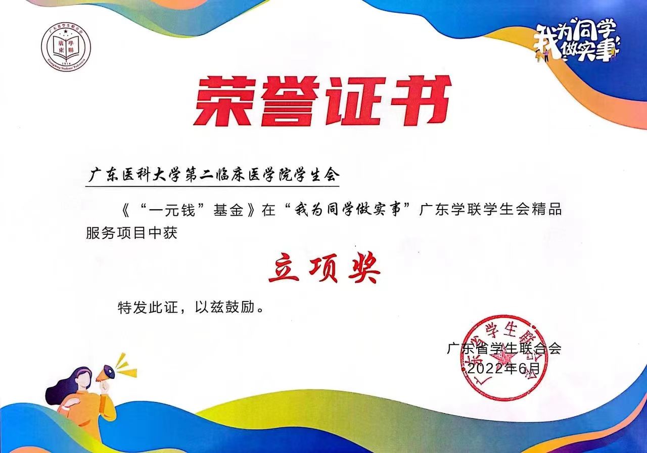 “一元钱”基金在“我为同学做实事”广东学联学生会精品服务项目评选中获立项奖