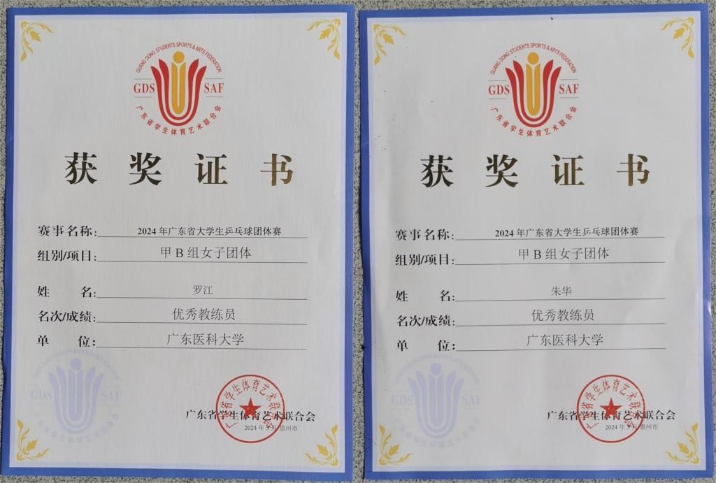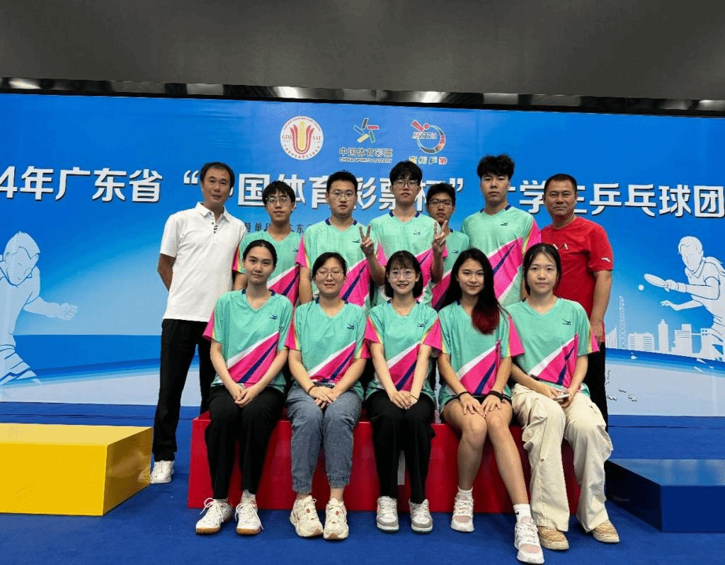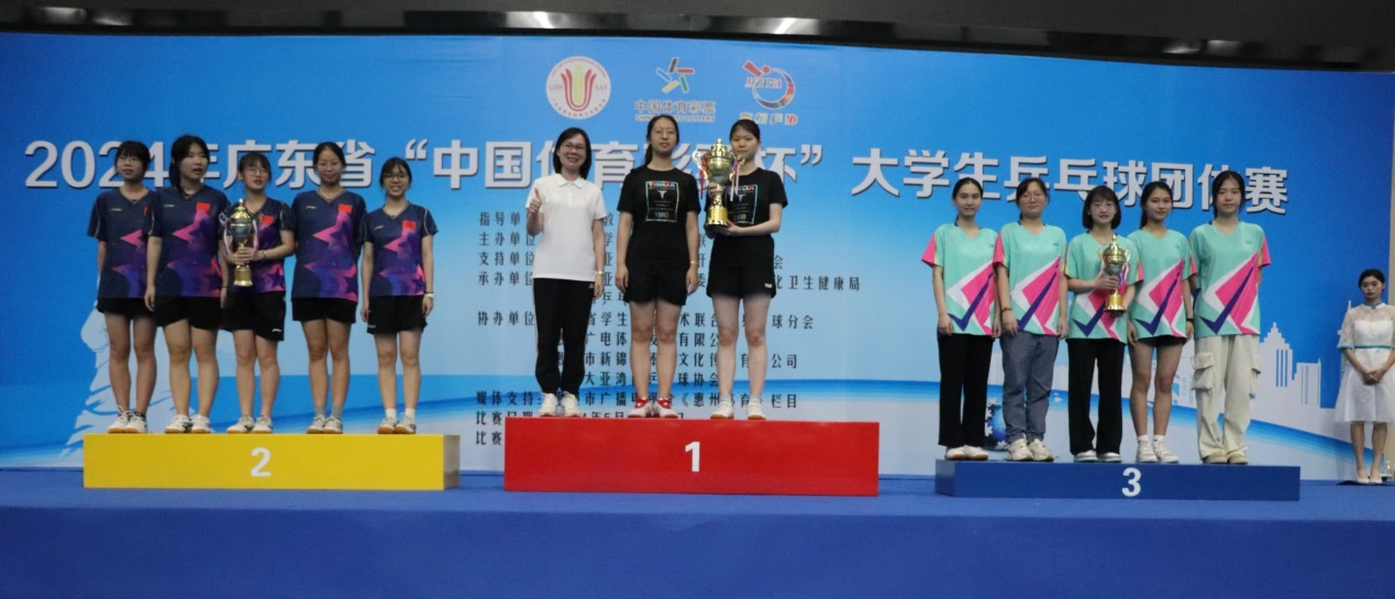 5月26日,2024年广东省“中国体育彩票杯”大学生乒乓球团体赛在大亚湾开发区奥林匹克体育公园综合馆落下帷幕。本次比赛由广东省学生体育艺术联合会主办、惠州大亚湾开发区管委会教育文化卫生健康局和惠州市乒乓球协会承办。来自全省65所高校乒乓球队共681名运动员、185名领队、教练员参加此次比赛。我校共派出10位队员,队员们在强手如云的赛场上敢打敢拼,以高昂的斗志和顽强的毅力,勇夺甲B组女子团体季军,获团体一等奖。创我校在该项赛事中的历史最佳成绩。教练员朱华老师、罗江老师获得“优秀教练员”荣誉称号。