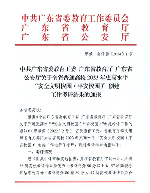 近日,中共广东省委教育工作委员会、广东省教育厅及广东省公安厅联合通报全省普通高校2023年度更高水平“平安校园”创建工作考评结果,我校在160所参评高校中脱颖而出,荣获2023年度广东省更高水平安全文明校园优秀等级。我校已连续两年获得省级优秀等次。