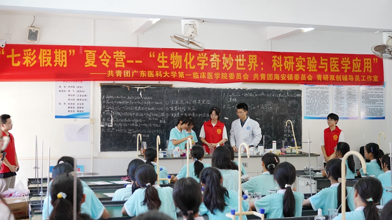 在湛江市徐闻县海安中学开展“红色文化植人心,医学科普进课堂”为主题的七彩假期暑期夏令营活动的是青春筑梦宣讲团。现场的初中生饶有趣味地参加“蓝眼泪”鲁米诺实验,“我们将生化实验带到了祖国大陆最南端的学校。试剂滴下去会有荧光效果,孩子们听得入迷,主要是启蒙他们对科学的兴趣。”青春筑梦宣讲团队长李謦彤介绍道,这支队伍主要由第一临床医学院科研站和青马班的同学组成。初二的伍柳霏同学坚定地向志愿者表示:“姐姐,我以后想学医,成为一名好医生。虽然我知道很辛苦,但这是我现在最想做的事!”