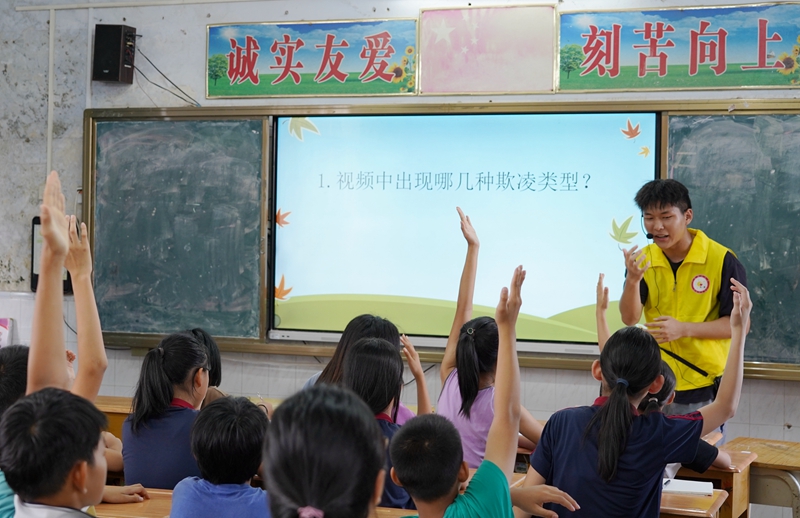 “什么是校园欺凌?”“生气的时候你会想到什么颜色?”“我给同学们演示一下海姆立克急救法。”在遂溪县草潭镇下六中心小学,煦爱志愿服务队同时有三门课在进行。黄少娥赞扬课程丰富多元,希望广东医的学子们将来能继续服务和帮扶遂溪教育。下六中心小学校长表示,学生们都非常喜欢上这些大哥哥大姐姐的课,好多孩子说要向哥哥姐姐学习,树立了考大学的目标。