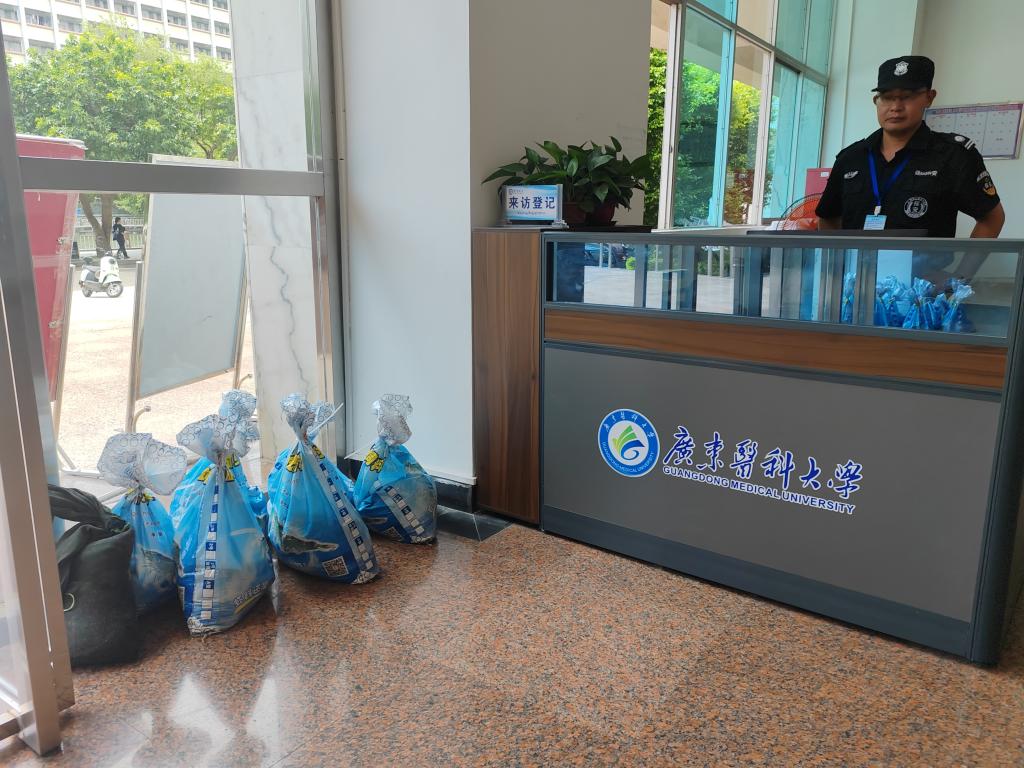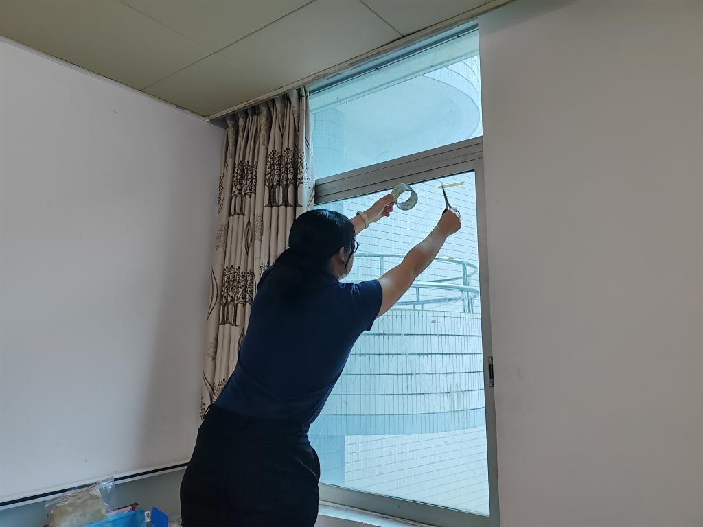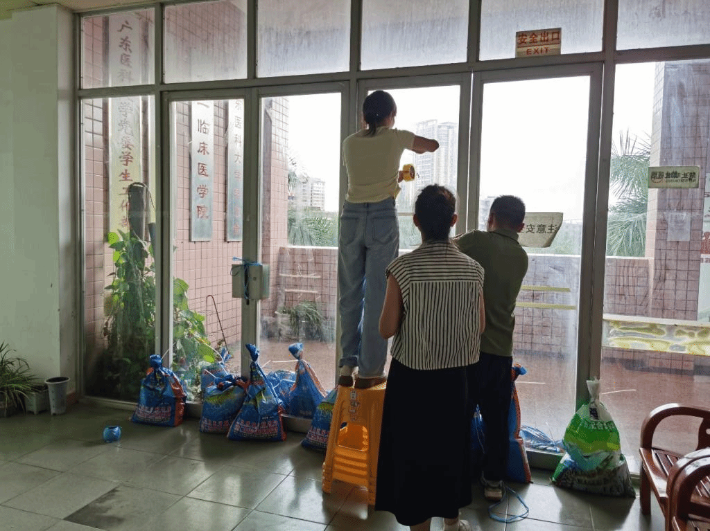 随着台风预警信号的接连发布,各学院迅速响应,成立抗击“摩羯”台风工作小组,齐心协力、全力以赴筑起校园安全防线,确保每位学生的安全与健康。为了确保所有学生都能及时收到台风预警并采取相应措施,第一临床医学院辅导们逐一走访学生宿舍,确认学生的在校情况及安全准备情况,检查是否有遗漏的防范措施,确保每位学生了解并遵循学校的安全指南。该学院工作小组为各年级学生分发了胶带,带领学生在宿舍的门窗上粘贴了“米”字形胶带,并通过电话、微信群等多种方式与家长保持密切联系,核实每位学生的具体在校情况,确保信息畅通无阻。