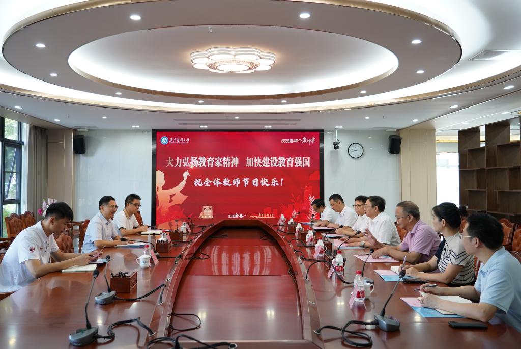在第40个教师节来临之际,9月10日上午,松山湖党工委委员、纪检监察工委书记温志强一行来校开展教师节走访慰问。学校党委常委、副校长刘新光,及高层次人才代表吴军教授、黄功华教授,与温志强一行进行了座谈交流。