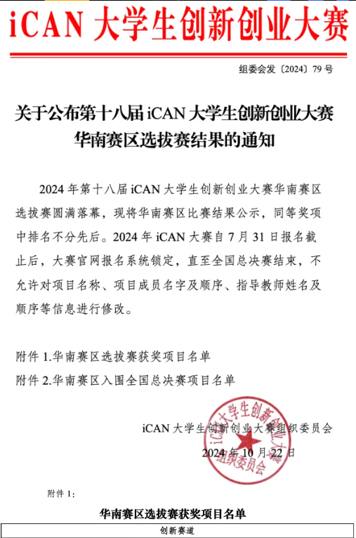 10月19日,第十八届iCAN大学生创新创业大赛(以下简称iCAN大赛)华南赛区选拔赛在广州城市理工学院成功举办。我校生物医学工程学院(未来技术学院)丘文峰和钱刃老师指导的参赛队伍获得一等奖,入围全国总决赛。