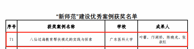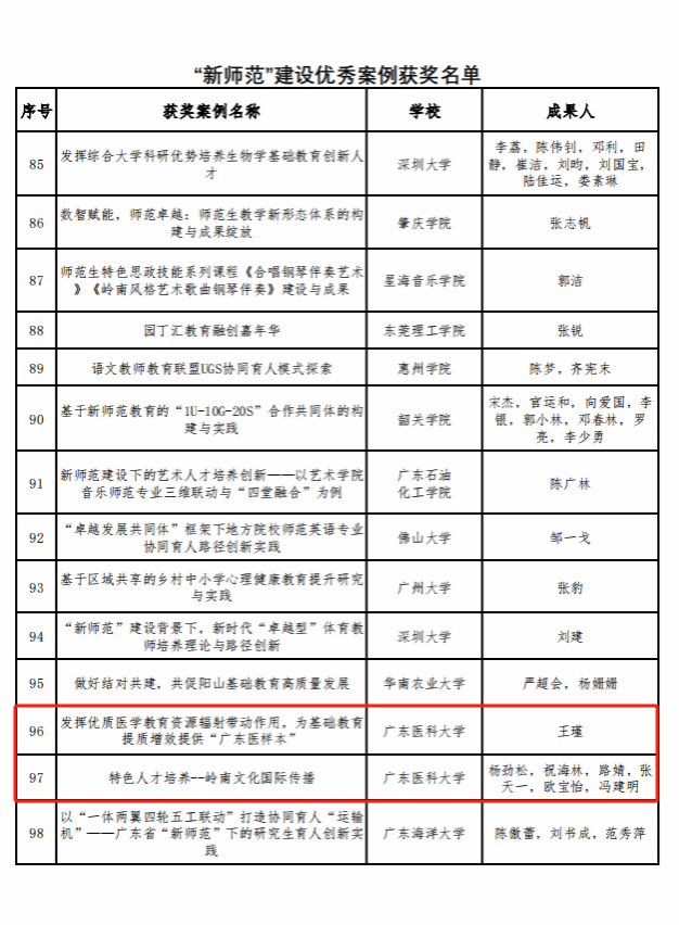 近日,广东省“新师范”建设指导委员会公布了《“新师范”建设优秀案例获奖名单》的结果,我校《发挥优质医学教育资源辐射带动作用,为基础教育提质增效提供“广东医”样本》《特色人才培养——岭南文化国际传播》《八仙过海教育帮扶模式的实践与探索》3个案例获奖,其中包含我校全方位全口径融入式帮扶湛江市及霞山区基础教育相关工作案例2项,我校心理健康教育与咨询中心叶馨副主任在一流师范人才培养暨“新师范”建设成果交流会上做了发言。