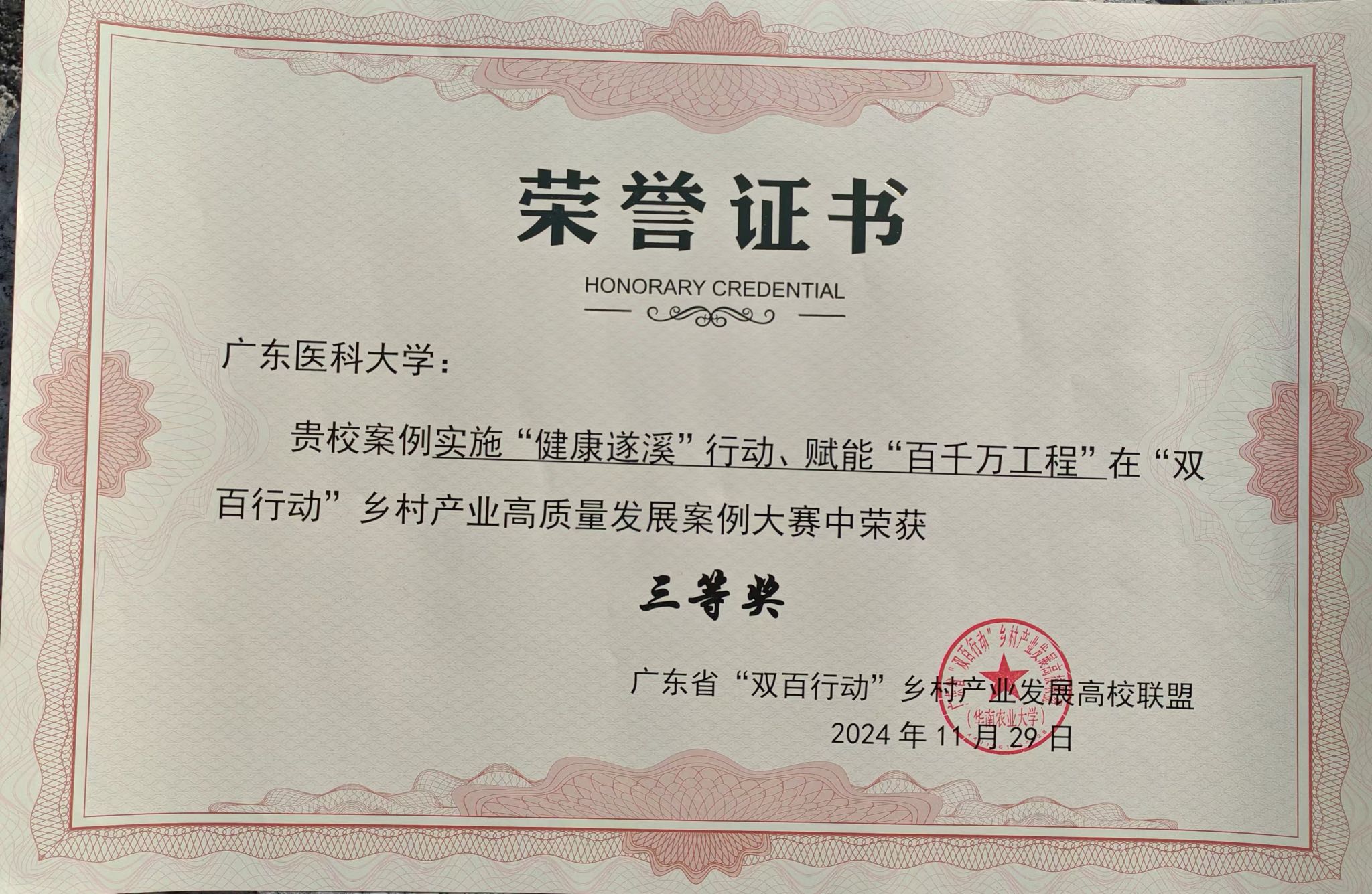 11月29日,广东省农业科技创新联盟与广东省“双百行动”乡村产业发展高校联盟2024年度科技成果交流暨家禽产业大会在仲恺农业工程学院白云校区召开。颁奖仪式上,我校“实施‘健康遂溪’行动、赋能‘百千万工程’”案例,在“双百行动”乡村产业高质量发展案例大赛中荣获三等奖,这是我校积极投身百千万工程“双百行动”的其中一项成果。
