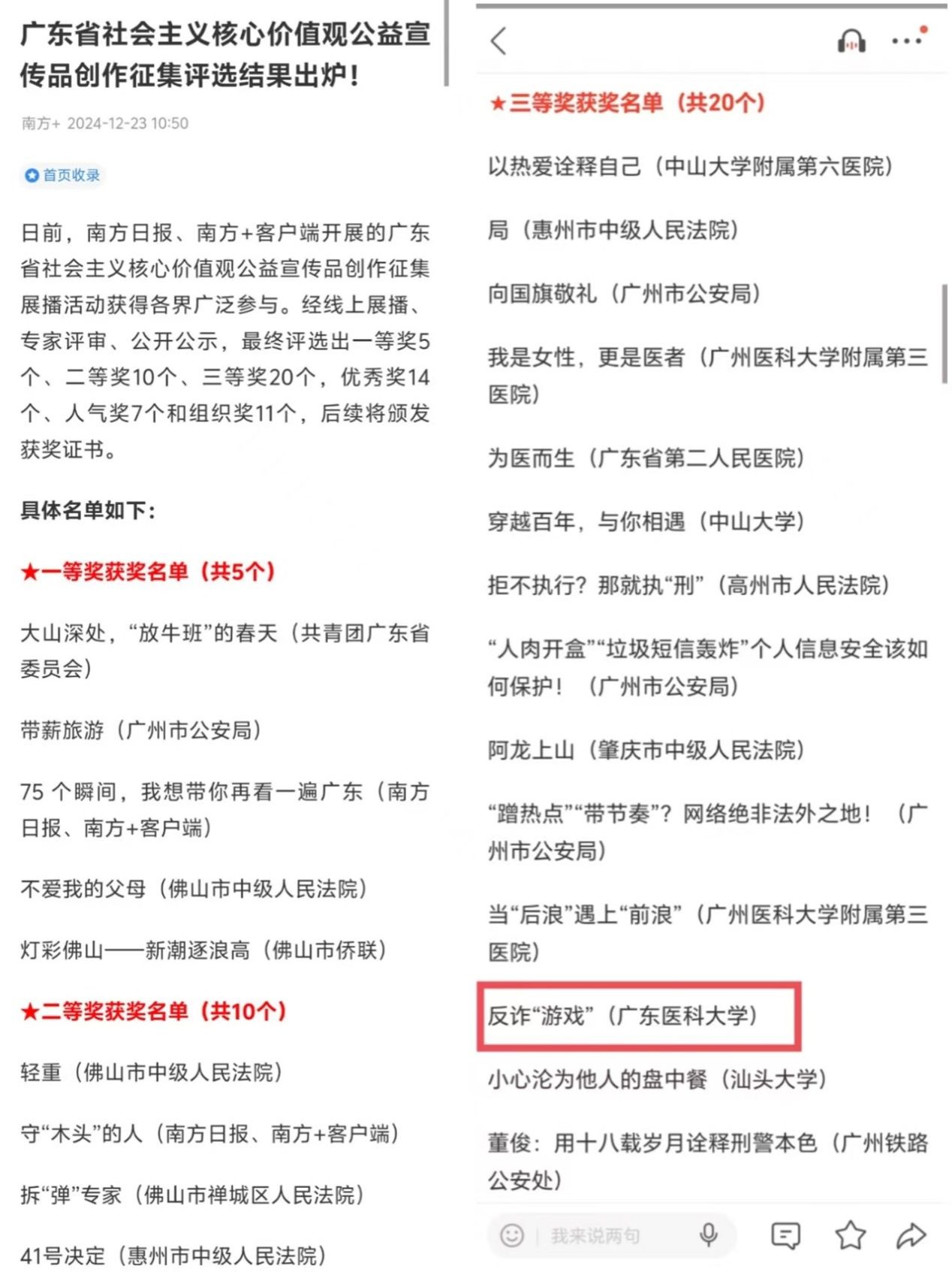 为深入贯彻落实习近平总书记关于社会主义核心价值观建设的重要论述精神,由省委bevictor伟德官网指导,南方日报、南方+开展的广东省社会主义核心价值观公益宣传品创作征集展播活动于近日满落下帷幕。经线上展播、专家评审、公开公示,最终评选出一等奖5个、二等奖10个、三等奖20个,优秀奖14个、人气奖7个等。其中,由我校周圆、徐畅老师指导,罗淳康、邓芷莹、吴文莉、刘望龙、黄禹诚、符川川、金士博、陈子欣同学组成的参赛团队的作品《反诈“游戏”》荣获三等奖。