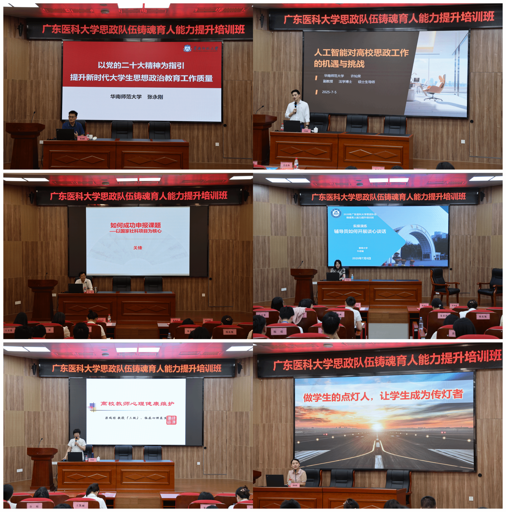 本次培训紧扣“思政队伍铸魂育人能力提升”主线,课程设置兼具理论深度与实践温度。既有“以党的二十大精神为指引提升新时代大学生思想政治教育工作质量”“人工智能对高校学生工作的机遇与挑战”等理论讲座,也有“如何提升科研项目申报能力”“辅导员谈心谈话实操演练”等实操指导;既有“高校教师心理健康维护”的人文关怀,也有“新时代思政课的价值引领与使命担当”的经验分享。