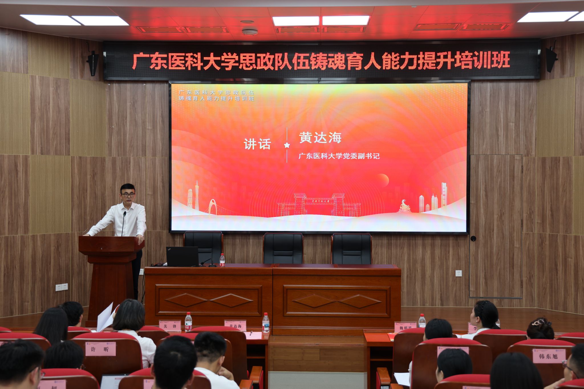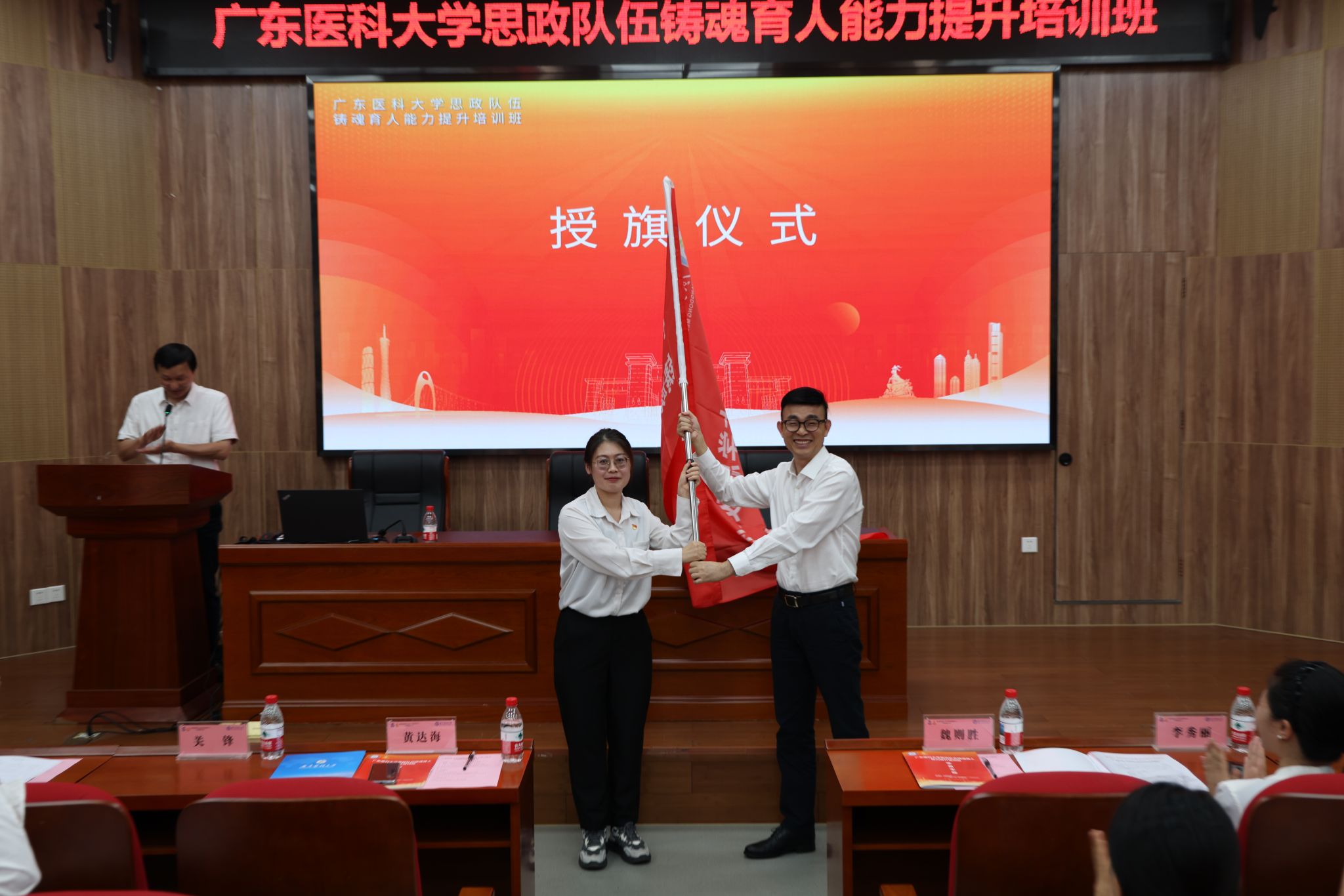 7月4日下午,培训班在华南师范大学桃李园三楼高明厅正式开班。学校党委副书记黄达海出席并作动员讲话,他强调,思想政治工作是学校各项工作的生命线,思政课是落实立德树人根本任务的关键课程,此次培训是学校为思政队伍量身定制的“成长阶梯”,希望大家提高政治站位、厚植育人情怀,坚持学用结合,锤炼过硬本领,严守培训纪律、展现良好风貌,以“空杯心态”投入学习,在政治引领、育人实践、创新转化能力上实现全面提升,真正成为学生“真心喜爱、终身受益”的引路人。黄达海副书记为培训班授旗。学员代表、临时党支部书记兼班长王凯丽表示,将珍惜机会、学深悟透,把学习成果转化为日常工作的“破题钥匙”,为学校思政工作高质量发展添砖加瓦。