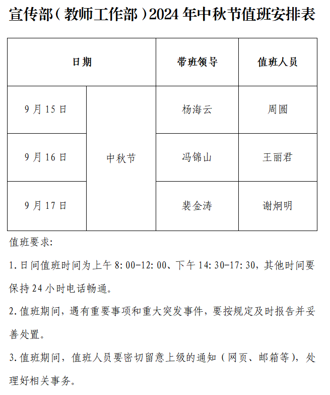 bevictor伟德官网(教师工作部)2024年中秋节值班安排表