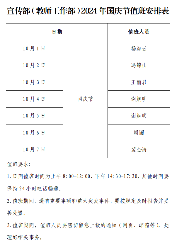 bevictor伟德官网(教师工作部)2024年国庆节值班安排表
