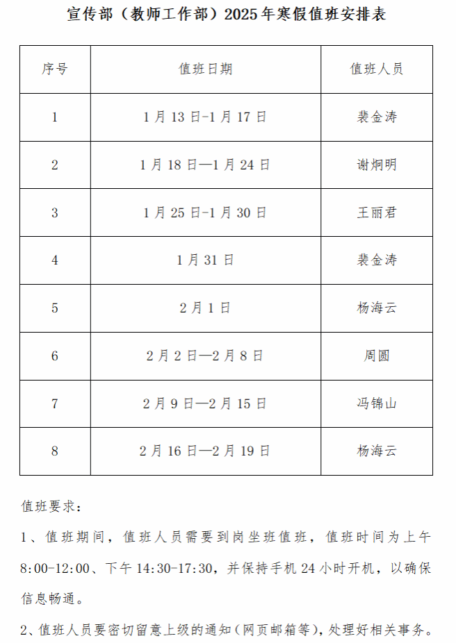 bevictor伟德官网(教师工作部)2025年寒假值班安排表