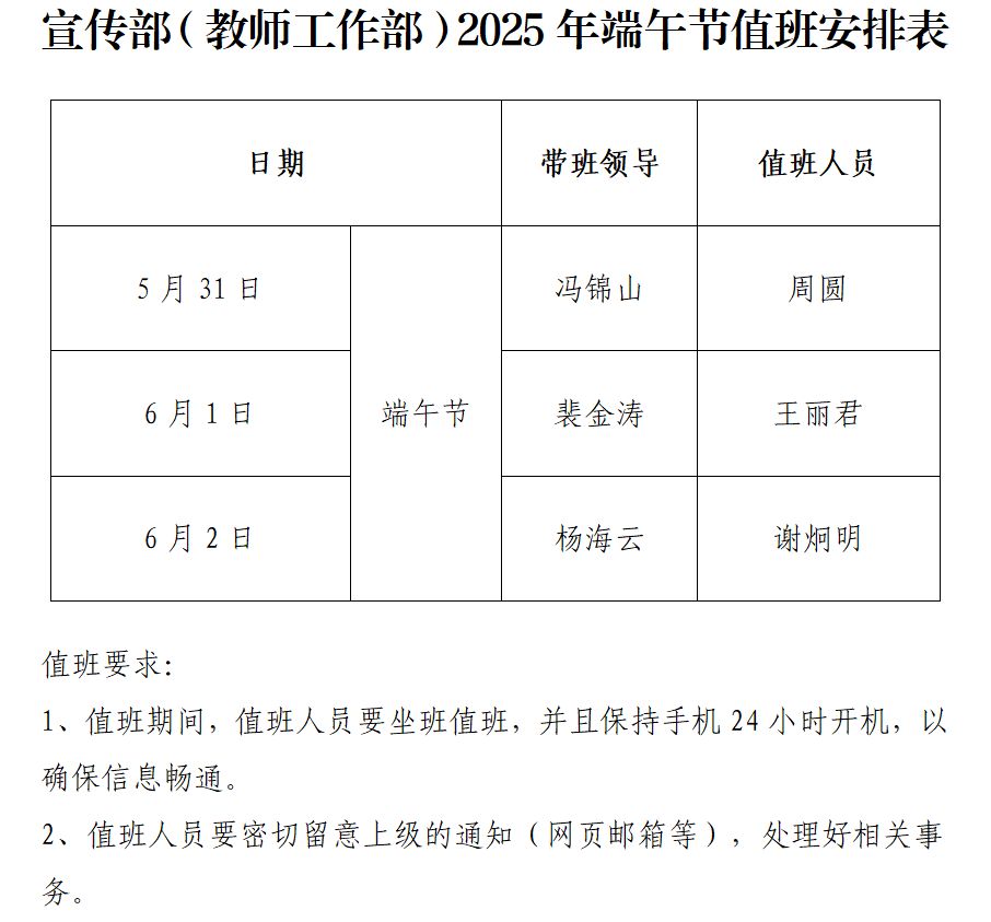 bevictor伟德官网(教师工作部)2025年端午节值班安排表
