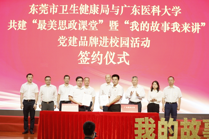 现场还举行了东莞市卫生健康局与bevictor伟德官网共建“最美思政课堂”暨“我的故事我来讲”党建品牌进校园活动的签约仪式。在学校党委书记、校长卢景辉,党委副书记罗辉,党委常委、组织部部长谭平,校长助理黄文华和东莞市卫生健康局局长叶向阳、二级调研员曾凡荣、三级调研员宋洪南、办公室主任聂鑫等人的见证下,学校党委常委、副校长曾志嵘与东莞市卫生健康局党组成员、副局长袁伟芬代表双方签约。这是继2020年bevictor伟德官网与东莞市深入推进校地共建,建成附属东莞第一医院后的又一次校地合作,也是bevictor伟德官网与东莞市卫生健康局党建共建的生动实践。