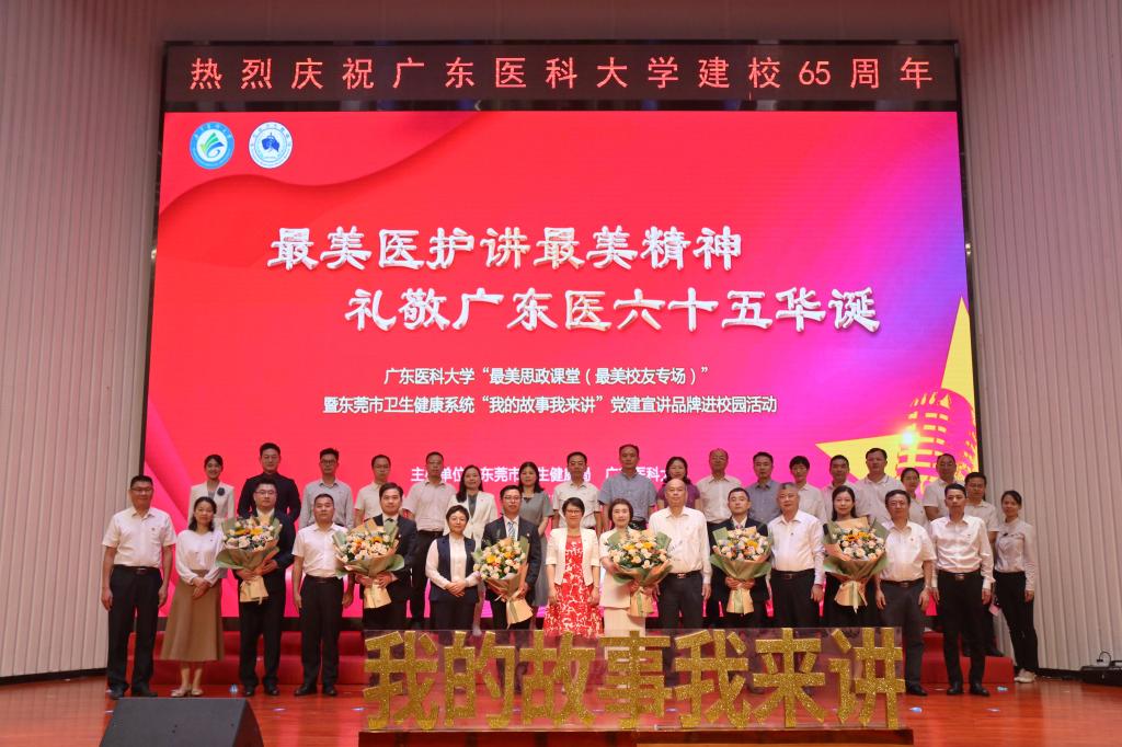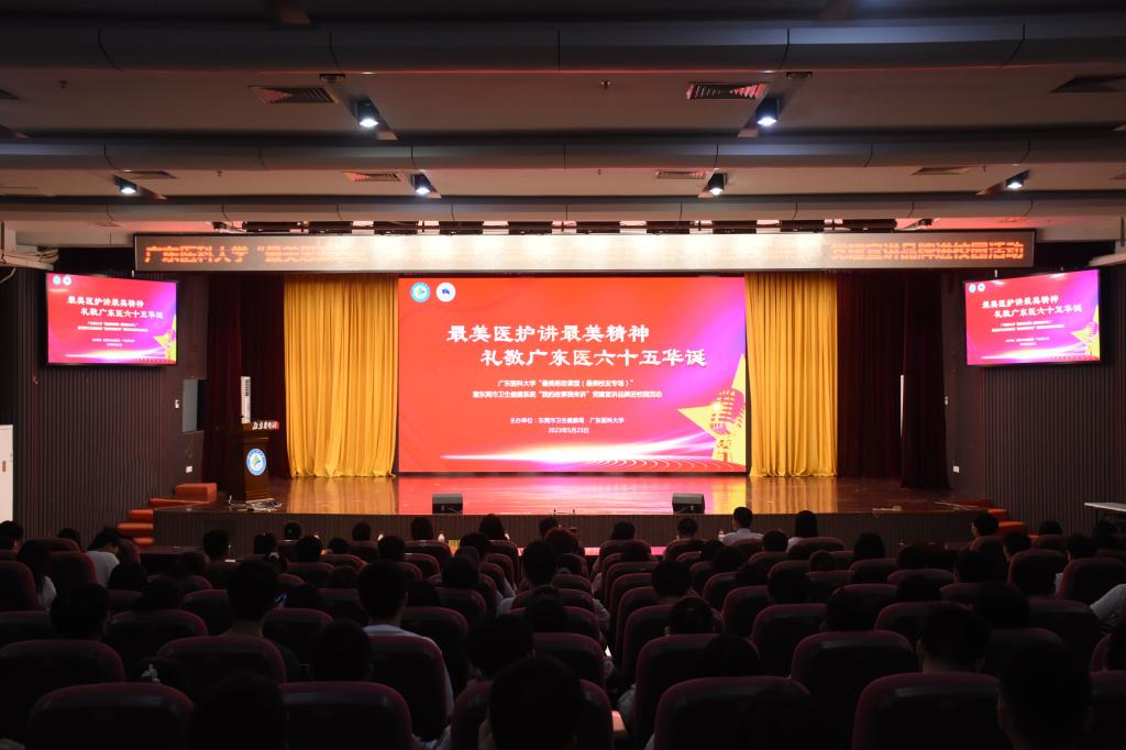 在学校迎来建校65周年华诞的美好时刻,5月23日,以“最美医护讲最美精神 礼敬广东医六十五华诞”为主题的“最美思政课堂(最美校友专场)”暨东莞市卫生健康系统“我的故事我来讲”党建宣讲品牌进校园活动在东莞校区图书报告厅隆重举行。六位校友、“最美医护”脱下白大褂,走进“最美思政课堂”,分享“最美精神”。东莞校区教学楼各教室、湛江校区、各附属医院以及各学生实习点的上万名师生和医护人员通过网络直播同步在线收听收看。