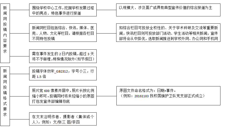 为进一步规范学校新闻采写相关流程,做到新闻宣传工作重点突出、亮点突出、层次分明,确保新闻发布及时有效,根据《关于开展“四问四做起”活动的实施方案》(广东医党发〔2016〕11号)的有关要求,对《bevictor伟德官网关于进一步规范新闻宣传管理的通知》进行完善。现公布《bevictor伟德官网新闻采写注意事项流程图》,请遵照执行。