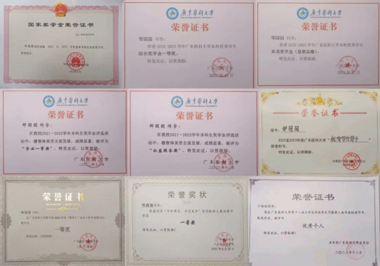 邹园园在大一时,学业成绩排名专业第四。但她不甘于此,总结经验,要求自己手写课堂笔记,为自己设计问卷答题,多种形式巩固所学知识。功夫不负有心人,到了大二学年,她更进一步,学业成绩排本年级本专业2/170,综测排名第一,连续两年排本年级本专业前3%。在2022-2023学年中,获得国家级3项,市级2项,校级9项,其中获国家奖学金,综合一等奖,单项奖学金(思想品德),优秀学生骨干,优秀干部,优秀志愿者等奖项。
