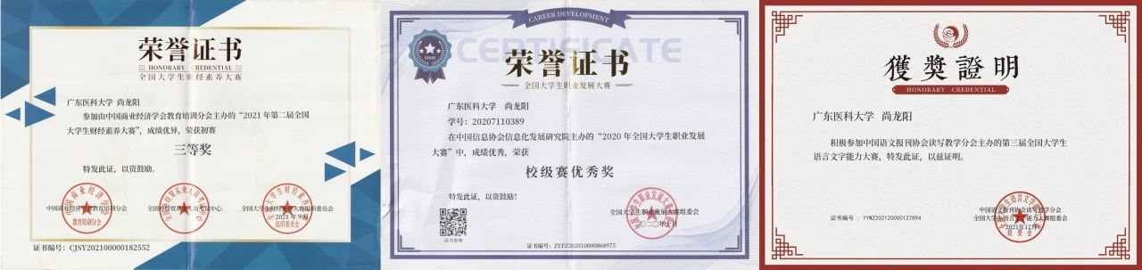 尚龙阳同学积极参加各种竞赛,并荣获2021第三届全国高校创新英语挑战活动优秀奖、2020年全国大学生“抗疫战疫”主题传染病预防知识竞赛优秀奖、“2020年全国大学生职业发展大赛”校级赛优秀奖、“第五届全国大学生预防艾滋病知识竞赛”优秀奖、“2020年第二届全国高校创新英语挑战活动英语词汇赛”优秀奖、“2021年全国大学生财经素养大赛”三等奖等奖项。