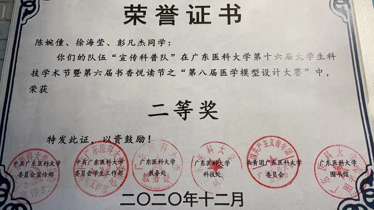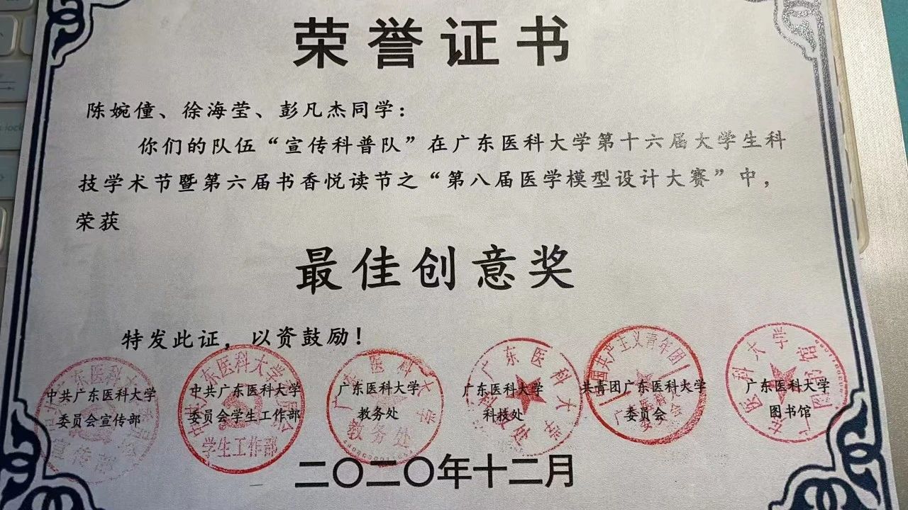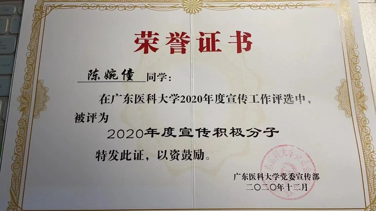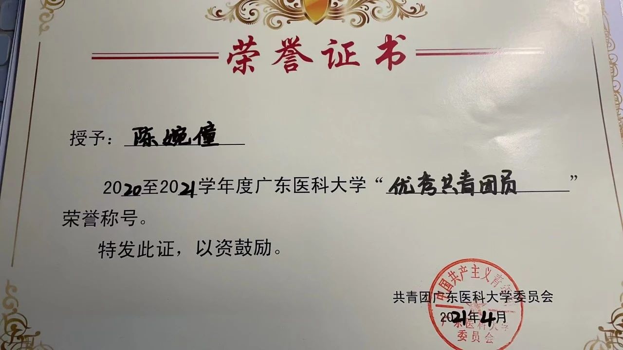 在大学期间积极参加各种校内外活动,注重培养活跃的思维和勇于创新的精神。陈婉僮曾参加学校举办的医学模型设计大赛并取得二等奖和最佳创意奖。她曾担任校友服务队队长,与师兄师姐相处融洽,搭建了在校生与师兄师姐沟通的桥梁,配合老师圆满完成各项活动和工作任务。