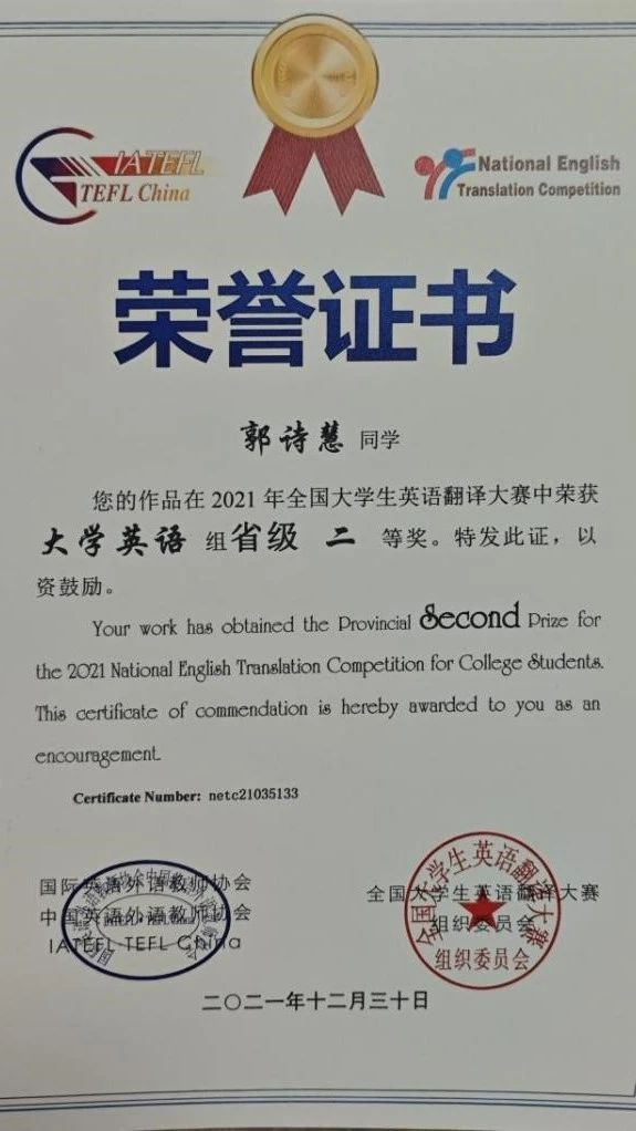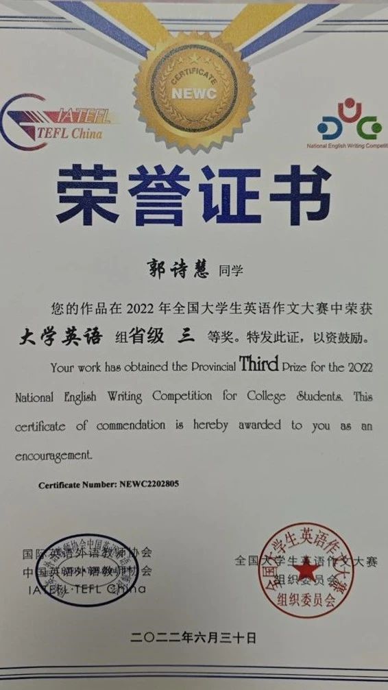 郭诗慧还积极参加全国大学生英语翻译大赛并荣获省级二等奖,参加全国大学生英语作文大赛并荣获省级三等奖等荣誉。