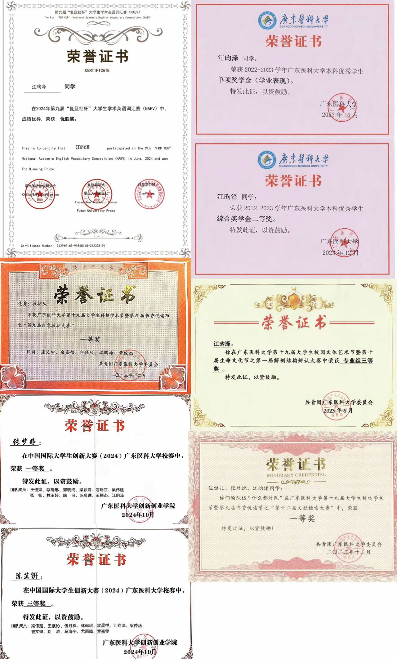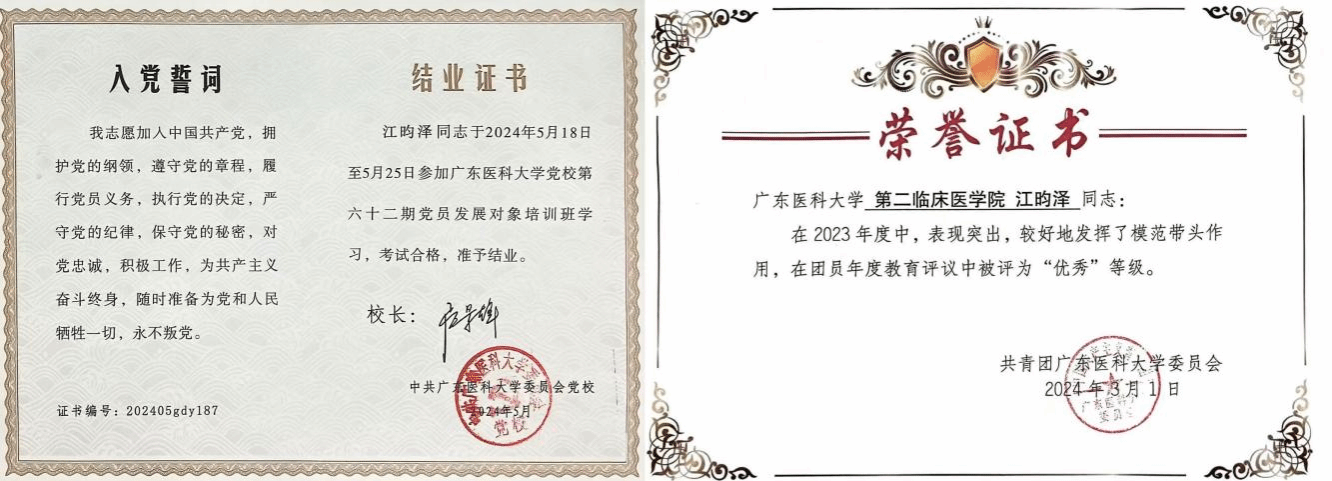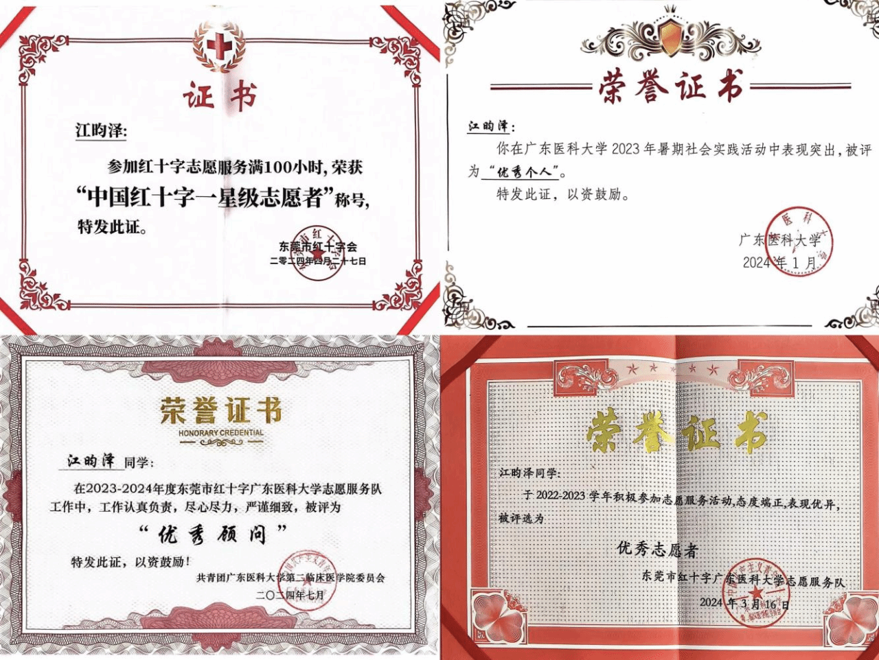 每一张证书,每一份荣誉,不仅是对他追求卓越的肯定,更是他勇于担当和不懈奋斗的见证。在人生的道路上,江昀泽将继续以满腔的热情和坚定的信念,深耕于医学领域,不断精进专业技能,书写更加辉煌的篇章。