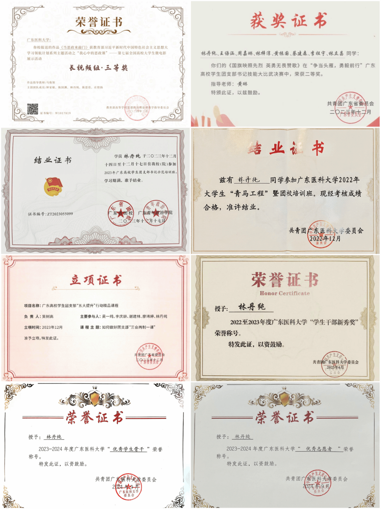 林丹纯,中共预备党员,外国语学院2022级英语1班学生,现任校招生宣传学生中心主席,曾获第七届全国高校大学生微电影展示活动三等奖、广东高校学生团支部书记技能大比武决赛二等奖、国家奖学金、综合一等奖学金、思想品德与美育素养单项奖学金等。