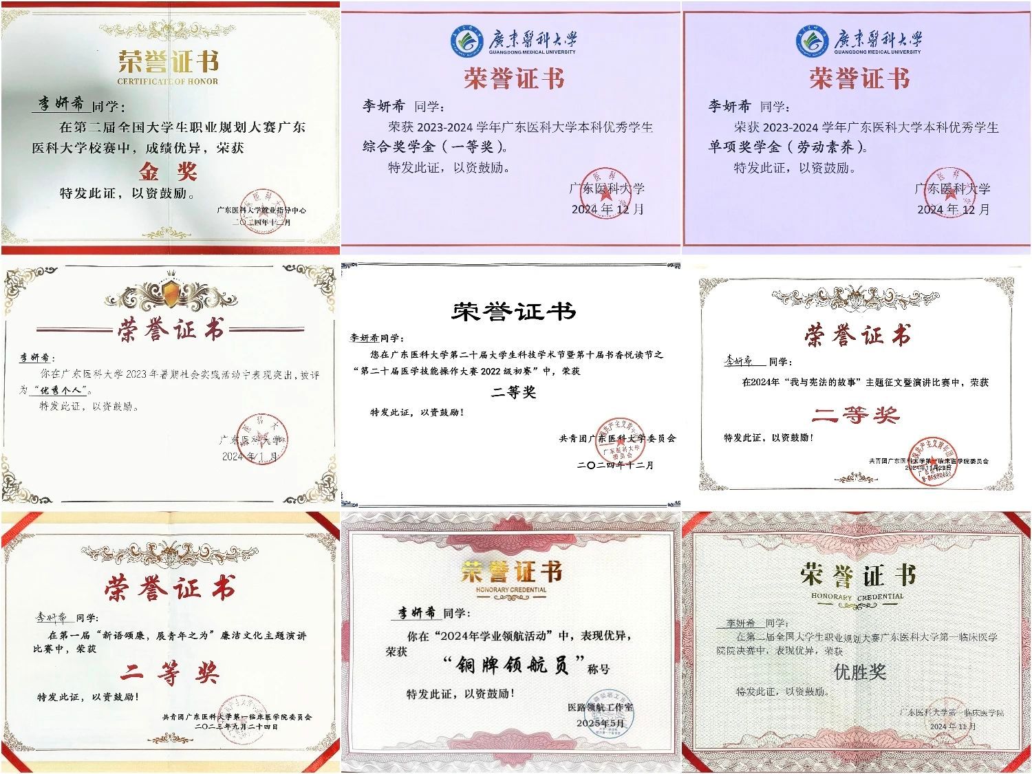 在学业上,李妍希更是成绩斐然。在大一大二学年中,她的学业加权成绩始终保持年级前4%,即便在转专业后综合测评排名也稳居前十。不仅如此,她积极参加学校各项比赛和活动,大一及大二均荣获综合奖学金一等奖,以及学业表现单项奖学金、劳动素养单项奖学金,第二十届医学技能大赛二等奖等多项荣誉。这些成绩的背后,是她对知识的渴望和对学业的执着追求。