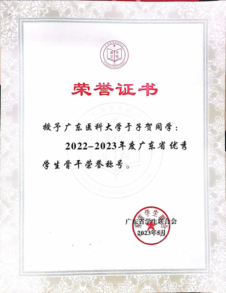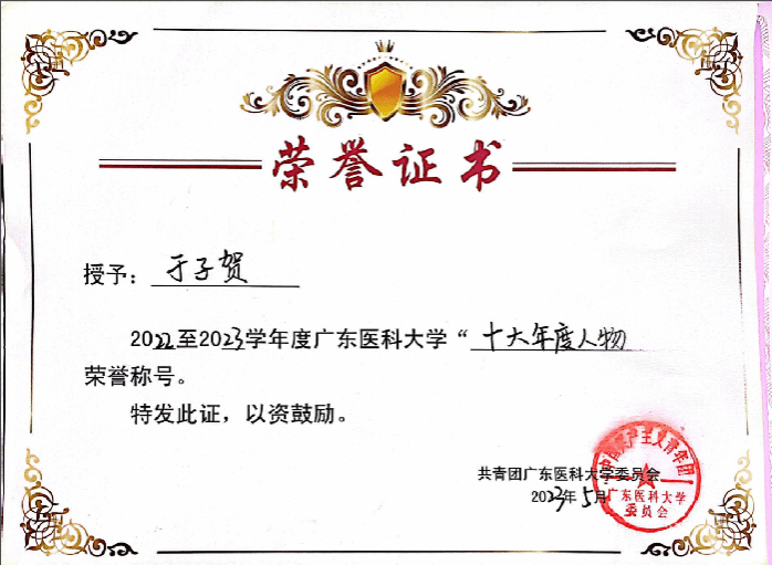 于子贺同学连续4年稳居专业第二,包揽9次奖学金,从国家奖学金到广东省优秀学生骨干,再到校“十大年度人物”,她用实力诠释“学霸”的厚度。参与发表1篇SCI论文,在学术赛道上留下惊艳足迹。是大学生创新创业训练计划省级项目负责人,并顺利结题。在剑桥大学暑假交流中带领小组斩获教授嘉奖信,用跨文化协助展现广东医学子的硬核竞争力。